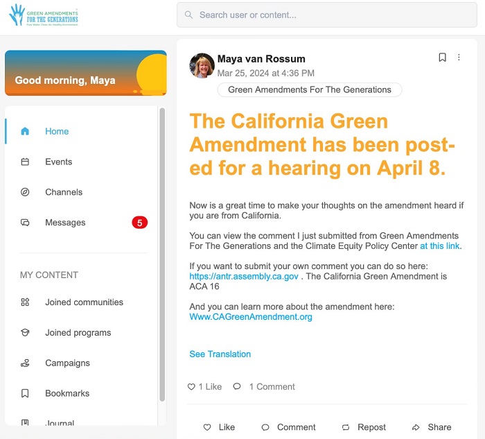 Another way to learn of the latest news and opportunities to engage in every active Green Amendment state is to join our Green Amendment Action Platform, a community dedicated to the Green Amendment movement. This is where we post the hottest news and opportunities for engagement, and where you can share your questions and meet fellow Green Amendment supporters in other states! Join now.